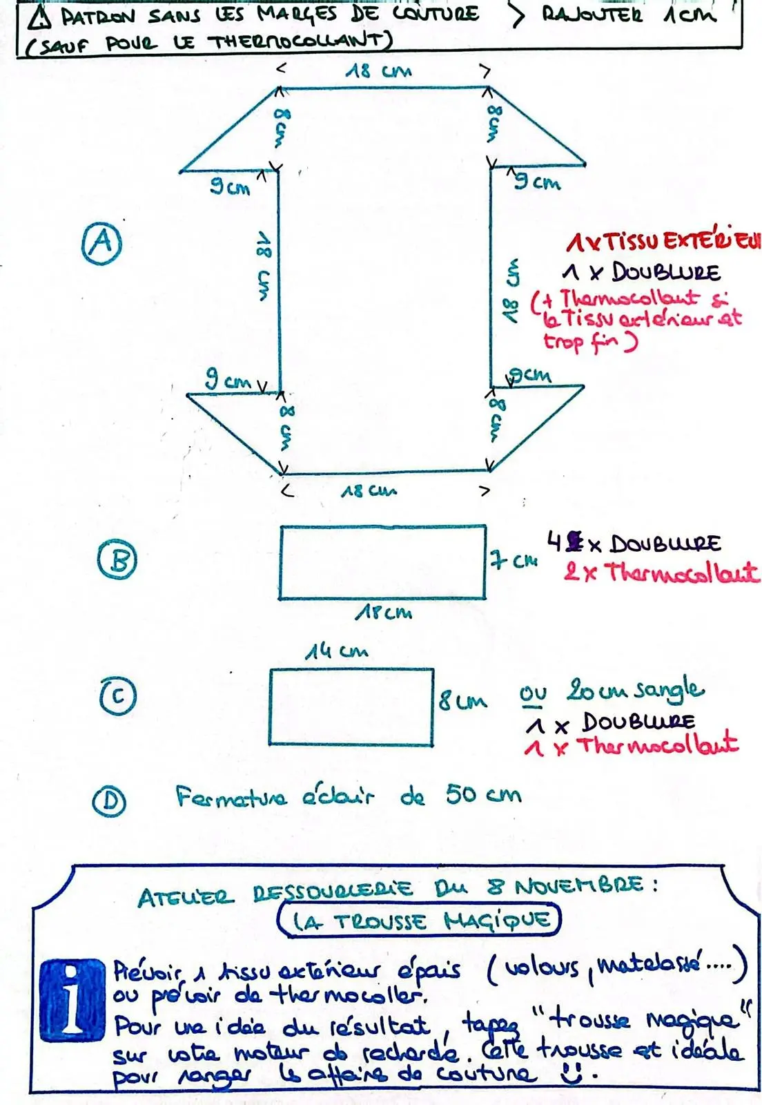 Cet atelier Couture et Bidouilles vous propose la pose d'une fermeture éclair, sur une trousse magique de toilette ou de couture... Si vous avez le temps, relevez le patron (voir image de l'événement) et découpez-le, et prévoyez tous les matériaux indiqués (tissu, thermocollant et fermeture éclair) ainsi que tout votre matériel de couture. Et si possible votre machine à coudre. Pour celles qui ont un autre travail (jean avec fermeture éclair ou autre travail), il vous est possible de l'apporter, une de nos bénévoles vous accompagnera dans votre projet à coudre.