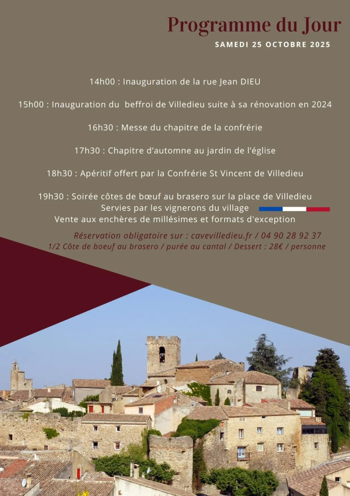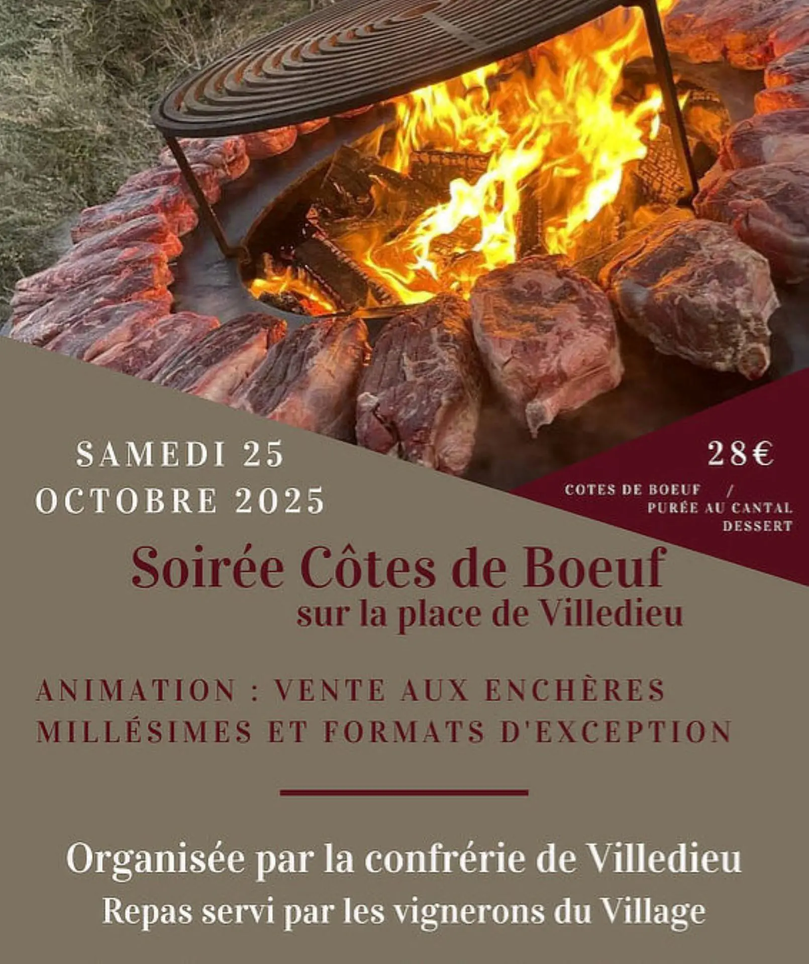- 19h30 : Soirée côtes de bœuf au brasero à la salle des fêtes de Villedieu servies par les vignerons du village, vente aux enchères de millésime et format d'exception.