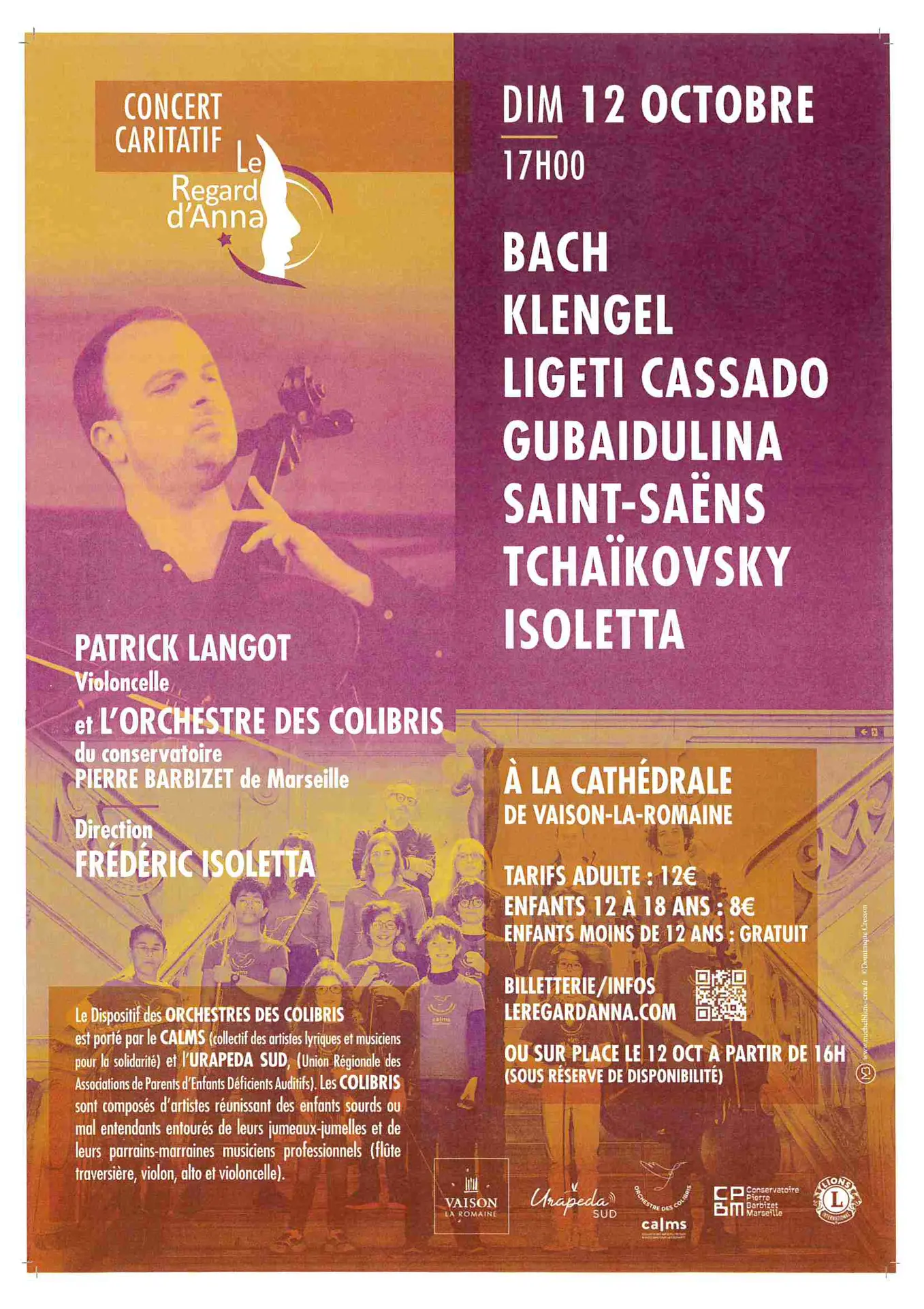 Fruit d’une collaboration entre l’association vaisonnaise Le Regard d’Anna et l’Urapeda Sud (Union régionale des parents d’enfants déficients auditifs) cet événement caritatif aura pour invité d’honneur le violoncelliste international Patrick Langot. Il sera accompagné par les Colibris, un orchestre mixte incluant enfants sourds, enfants entendants et musiciens professionnels. Cet ensemble marseillais évoluera sous la direction de Franck Isoletta.