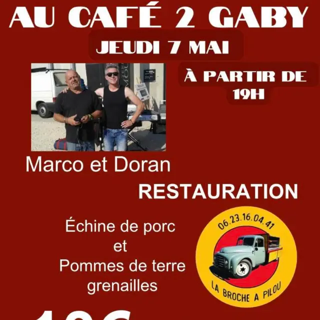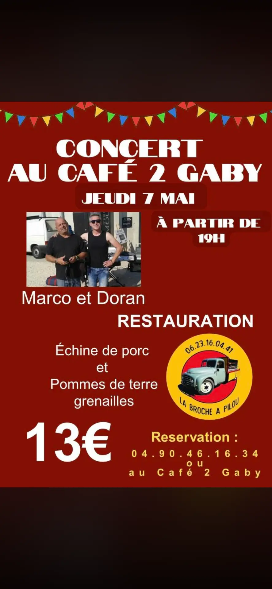 Concert et soirée au cœur de Rasteau, sur la place du village, avec Marc et Doran. Organisé par Café 2 Gaby. Restauration sur place avec La Broche à Pilou. Menu : échine de porc et pommes de terre grenailles.