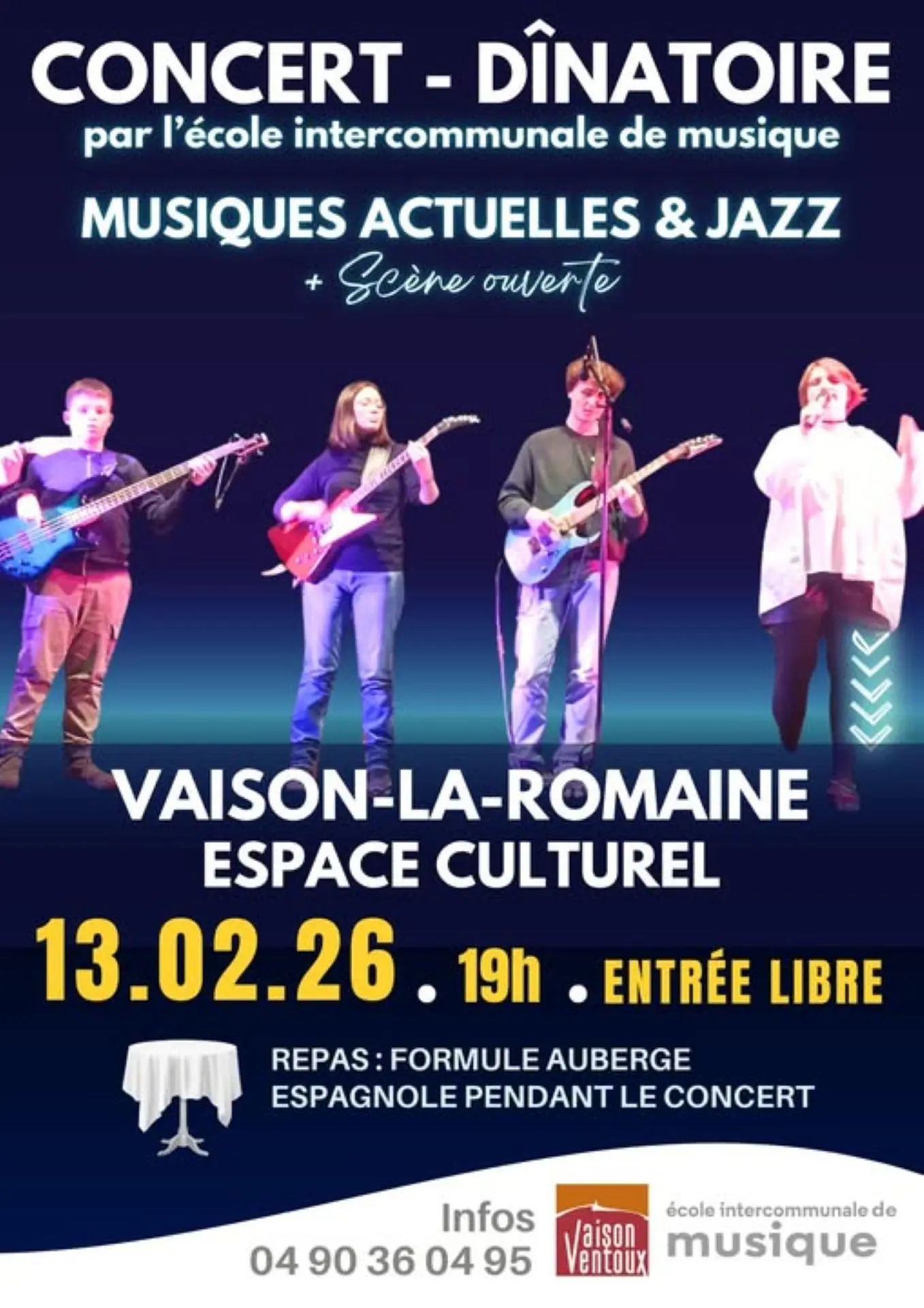 À cette occasion, plusieurs ensembles et groupes de l’école intercommunale se produiront pour une soirée placée sous le signe des musiques actuelles et du jazz, avec l'Ensemble de guitares, le Vasio Jazz Band et d’autres ensembles formés pour l’occasion ! La soirée se terminera par une scène ouverte où chacun pourra proposer les morceaux de son choix.