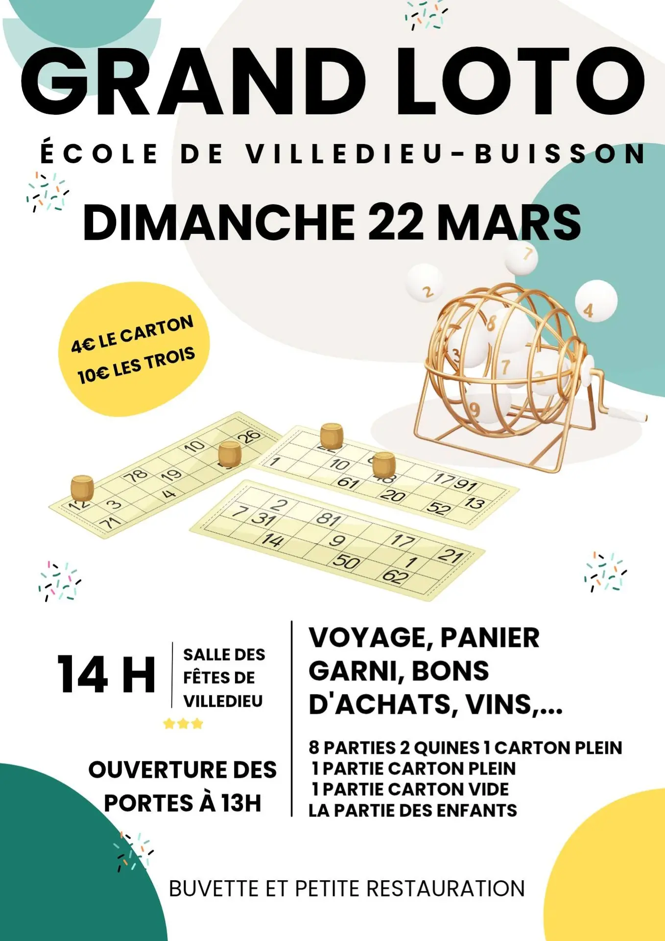 L'école de Villedieu Buisson organise son grand loto. Venez tenter votrechance, de nombreux lots sont à gaganer : voyage, panier garni, vins, bons d'achats...