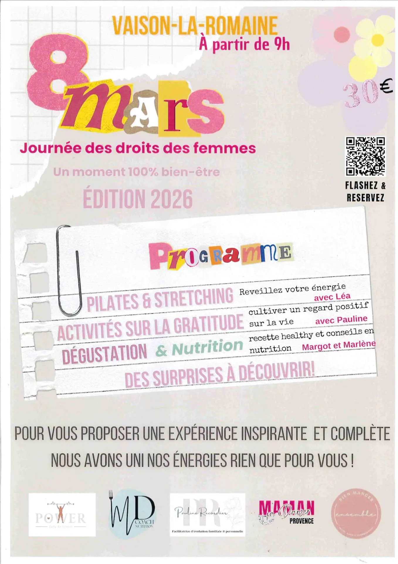 Une parenthèse dédiée aux femmes: Pilates, stretching, nutrition & surprises. Une pause inspirante pour énergie et équilibre. En partenariat avec Salle de Fitness Power, MD Coach Nutrition, Pauline Recordier & Ensemble Bien Manger. Lieu dévoilé 24h avant.