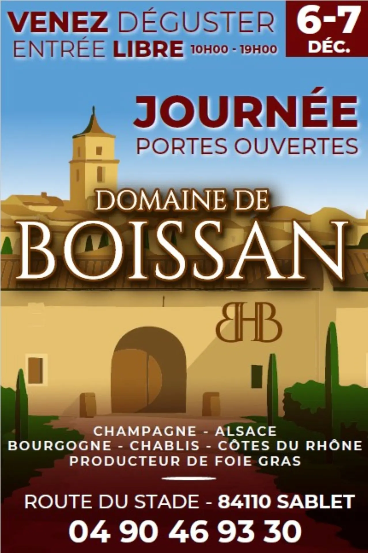 Journées portes ouvertes au Domaine de Boissan les 6 et 7 décembre. Repas grandiose et dégustation des vins du domaine, ainsi que de ses vignerons partenaires de Champagne, Alsace, Chablis et Bordeaux