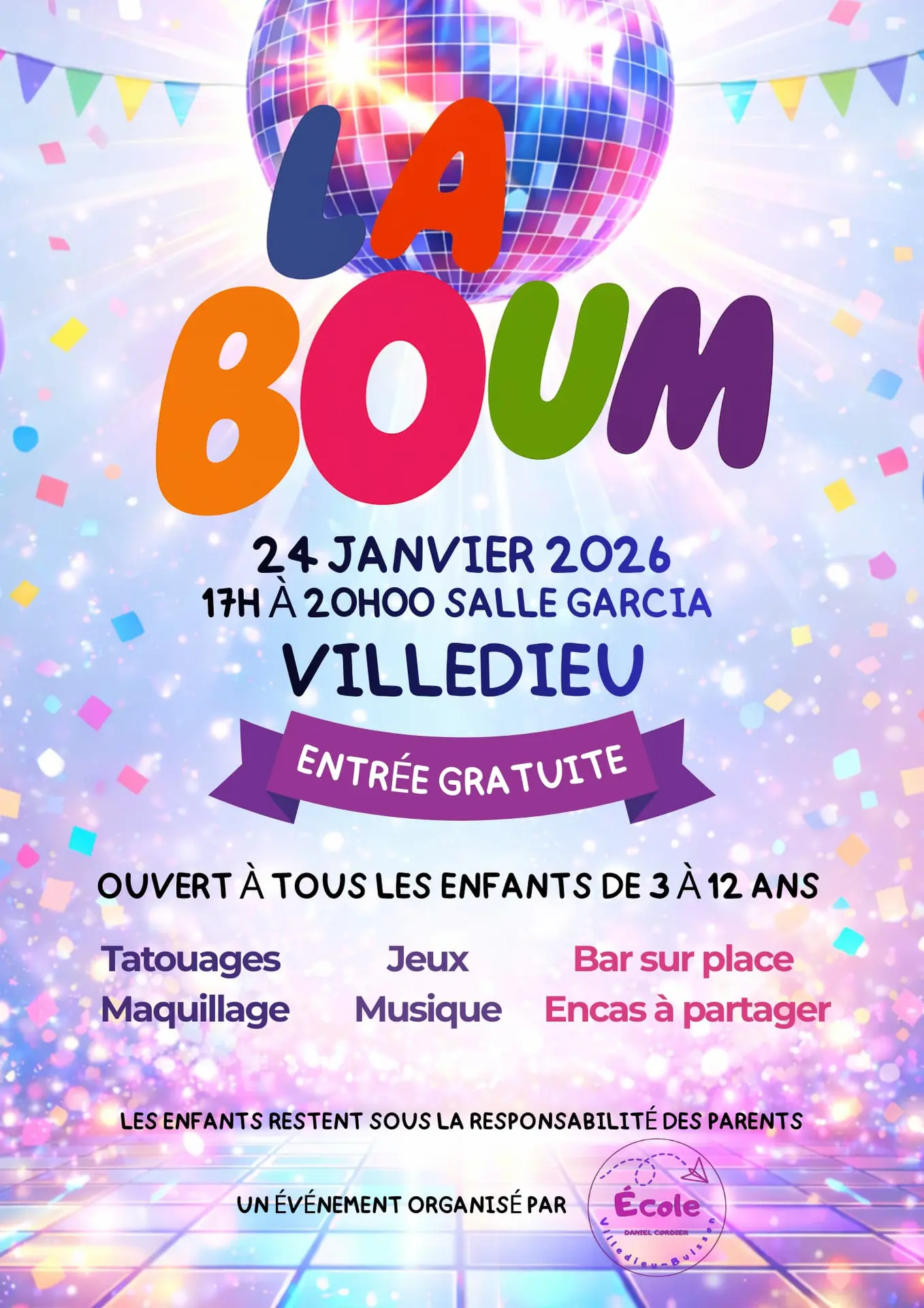Une boum pour les enfants de 3 à 12 ans avec musique, tatouages, maquillage, pop corn...