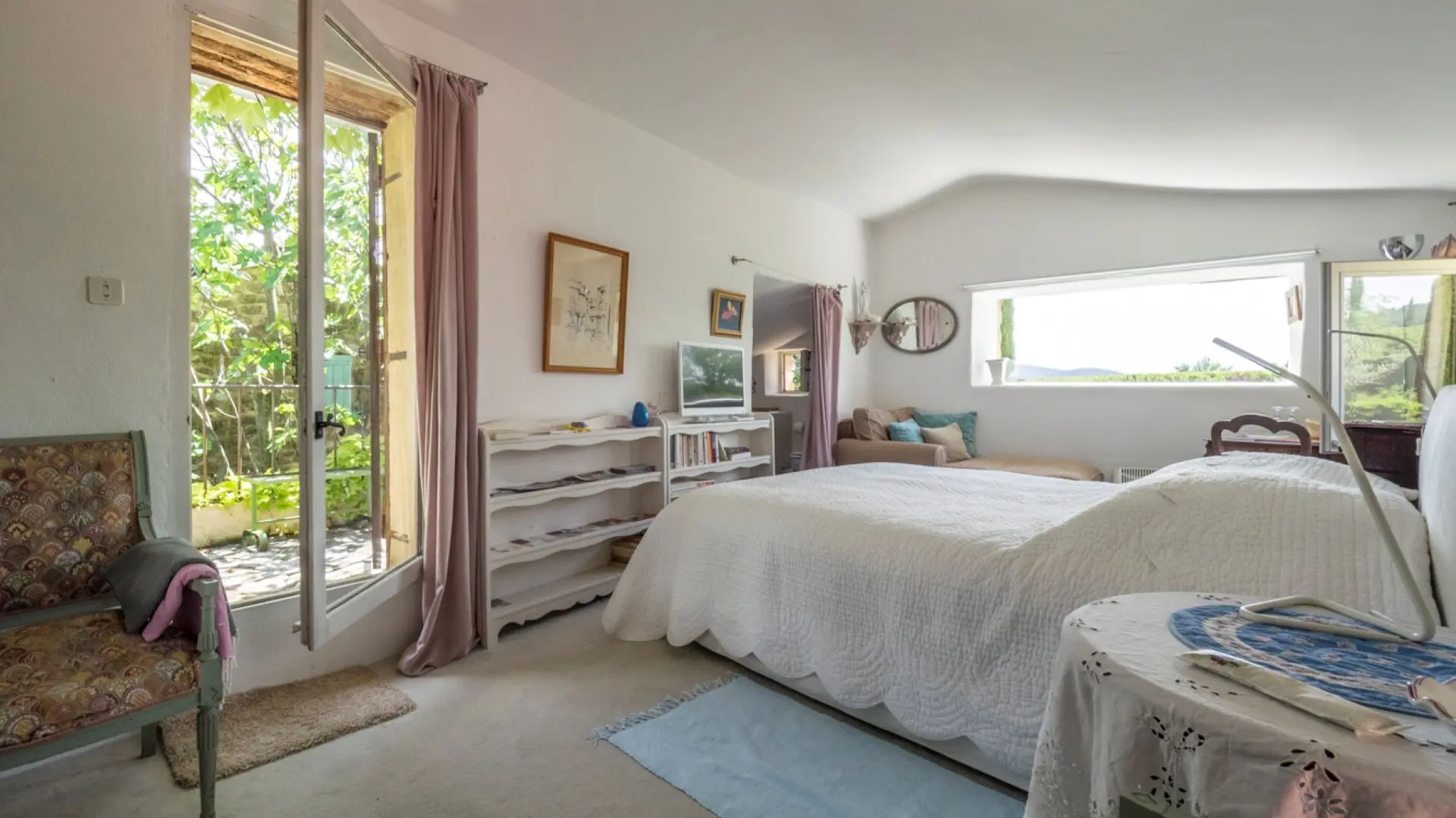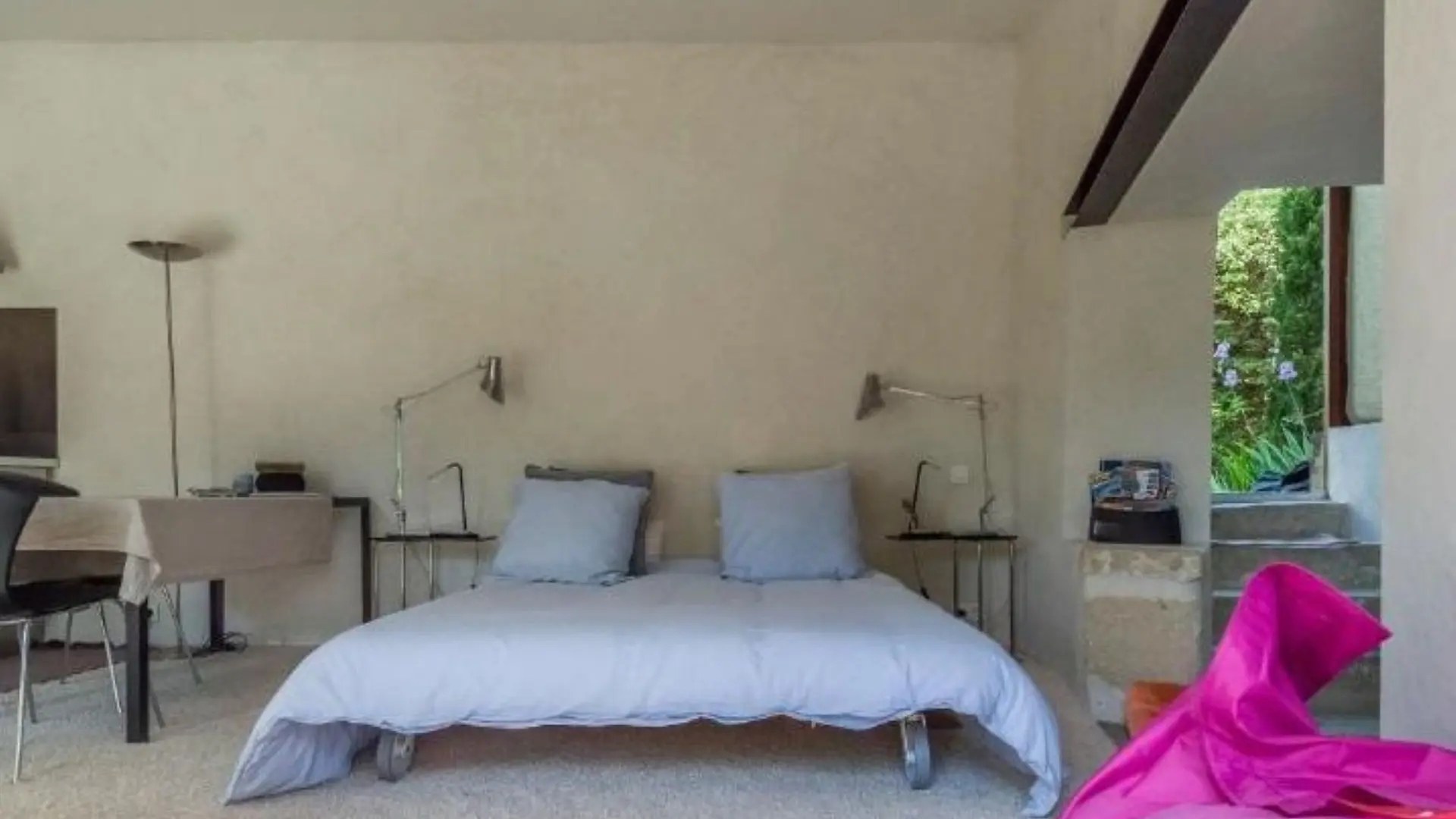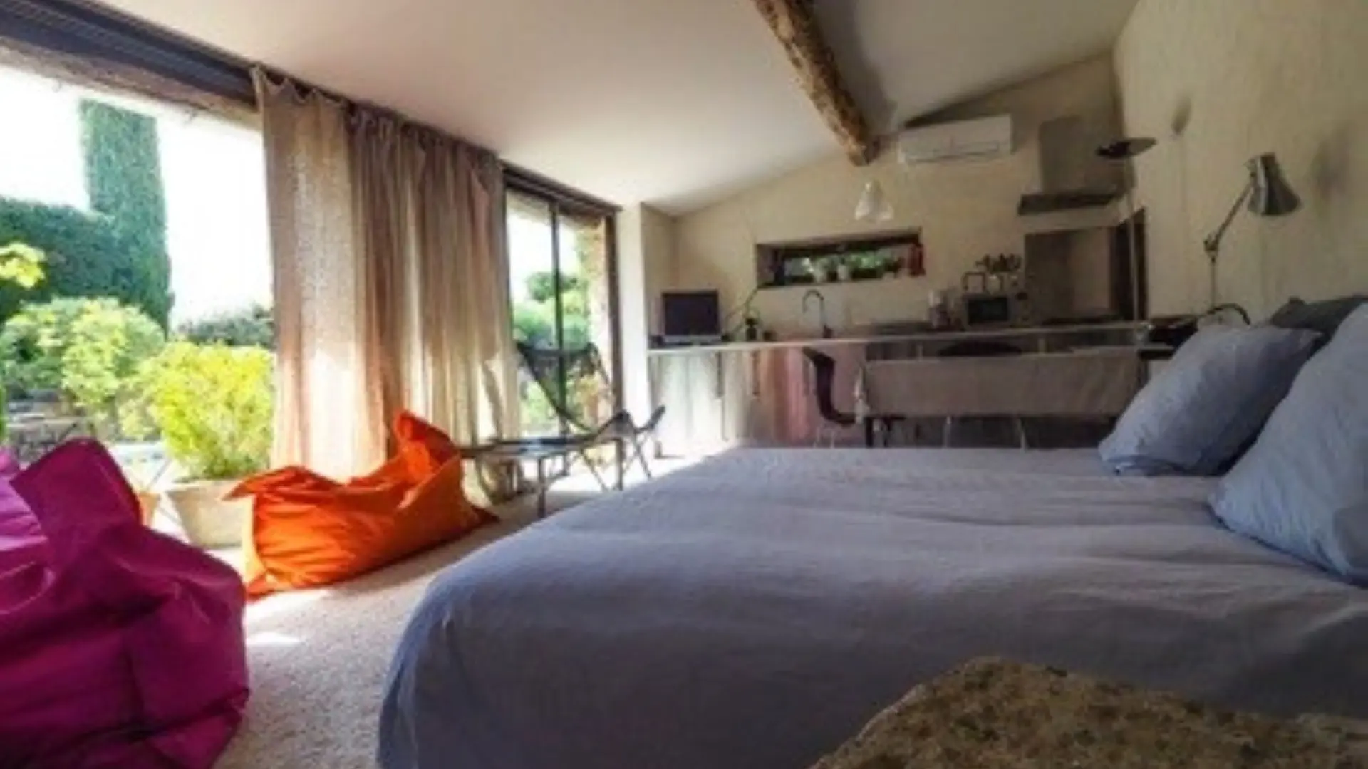 D’inspiration loft contemporain, c’est une chambre très confortable, lumineuse avec sa grande baie. Située en rez-de-jardin.