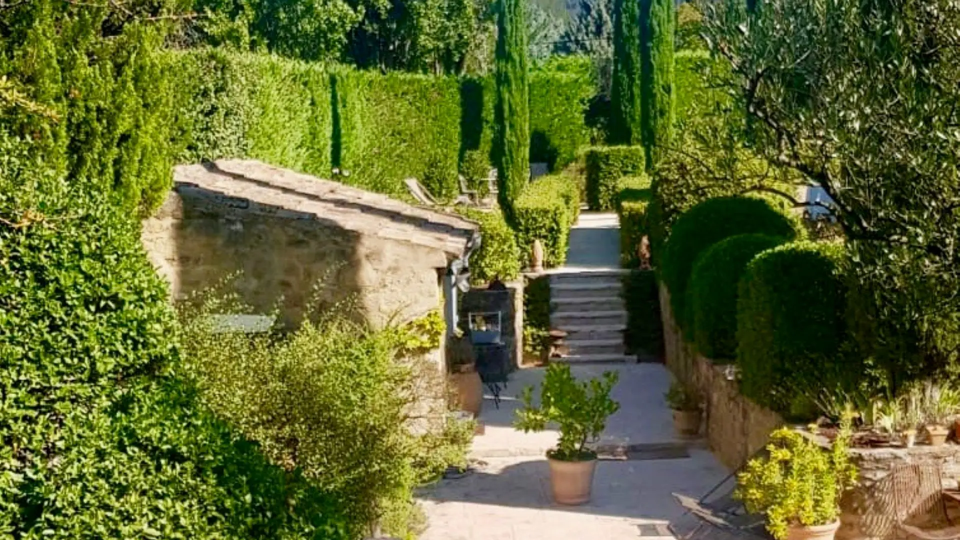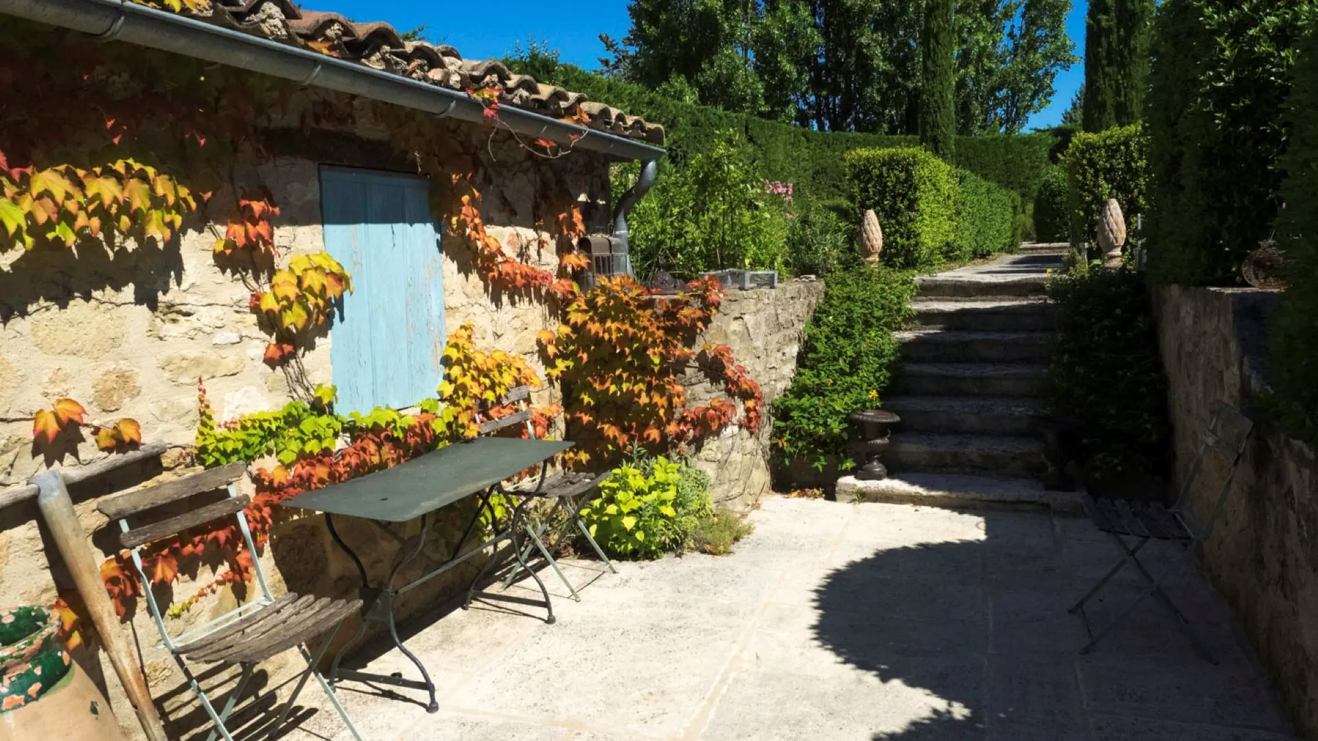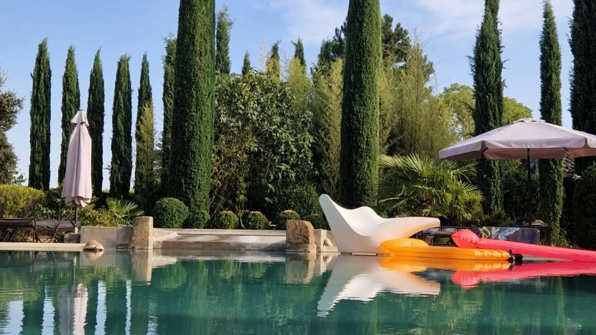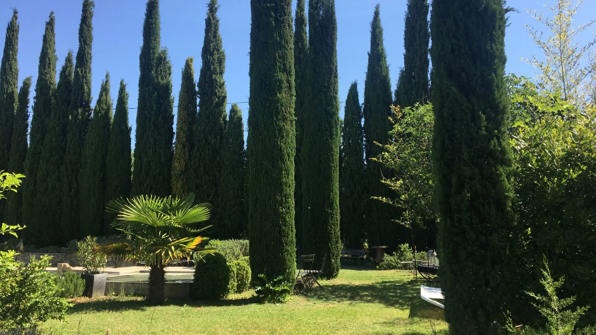 Terrasse privative pour le petit déjeuner en été, canapé et fauteuils, table et chaises, accès piscine et jardin.