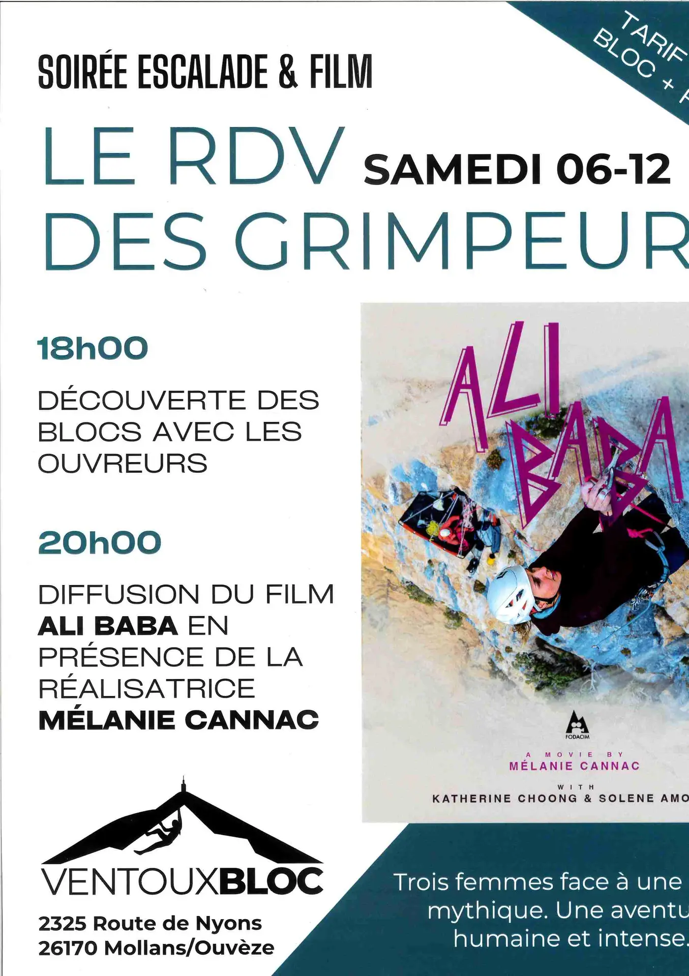 Dès 18h, découverte des blocs avec les ouvreurs. À 20h, projection du film Ali Baba et échange avec la réalisatrice Mélanie Cannac. Trois femmes face à paroi mythique : aventure humaine et intense.