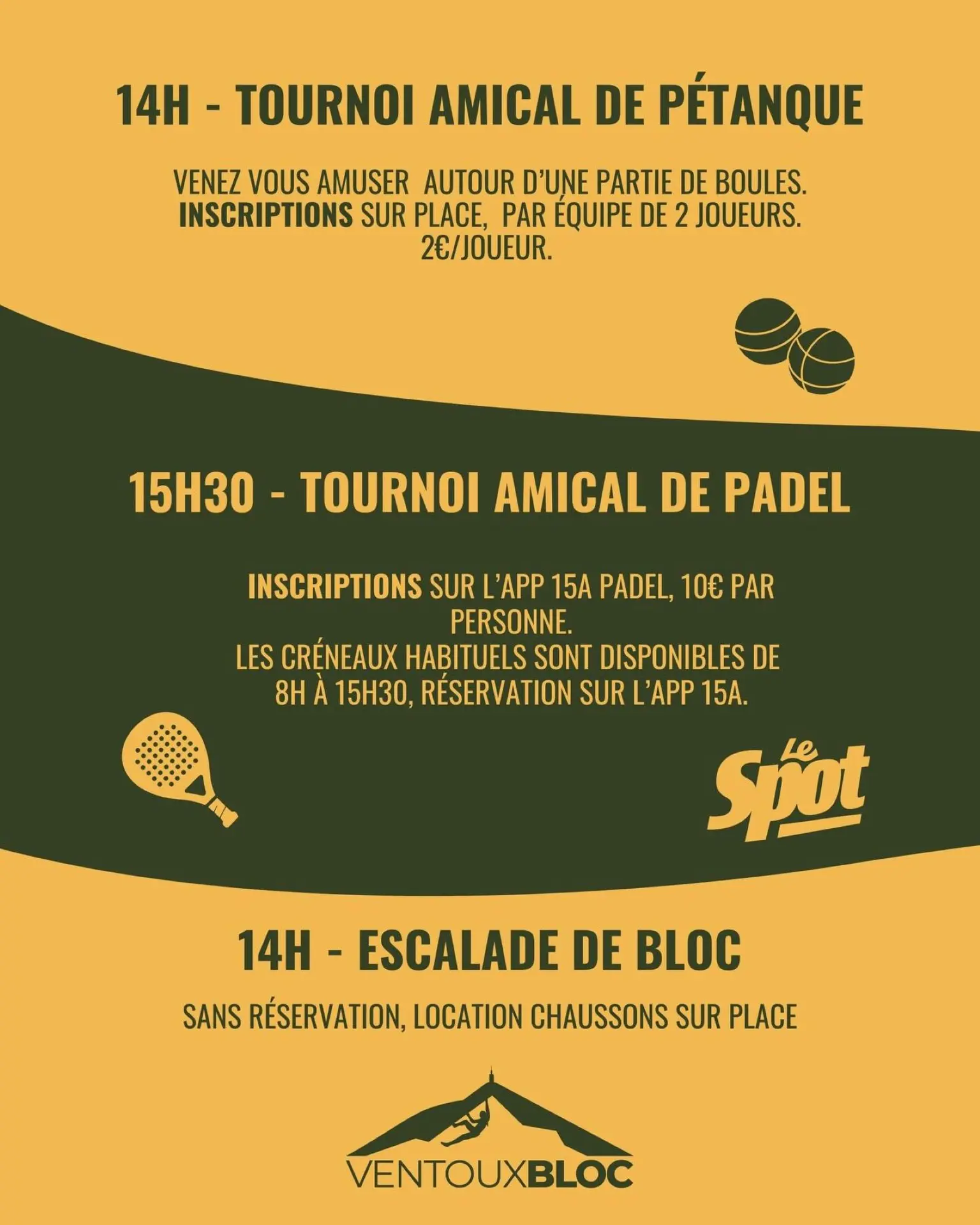 . 15h30 : Tournoi amical de Padel (inscription sur l'app 15A / 10€/pers)