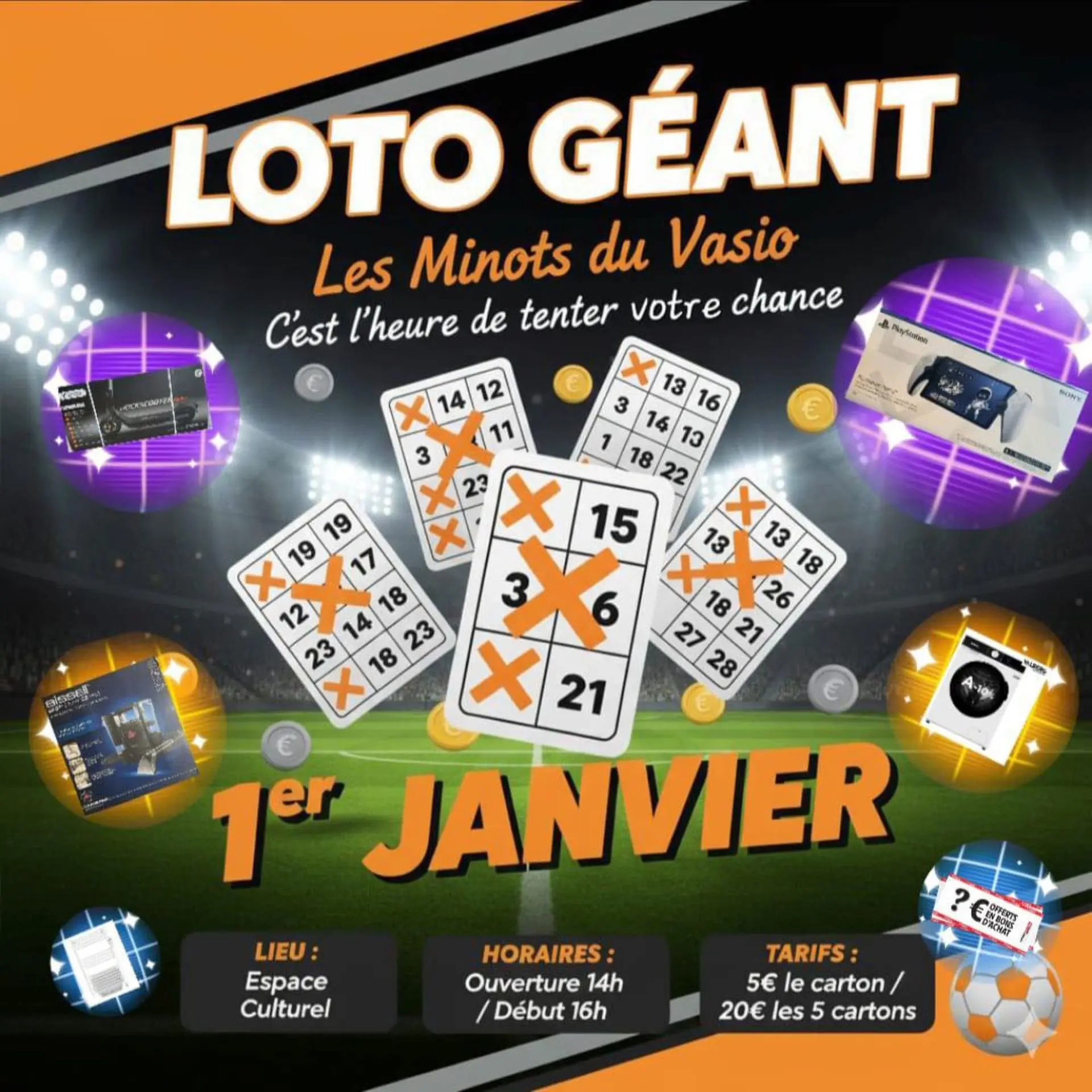 Les Minots du Vasio vous invitent à commencer l'année sur une note festive et conviviale. De superbes lots à gagner : PlayStation portable, trottinette électrique, machine à laver, bon d'achats et bien plus encore. Buvette et petite restauration sur place