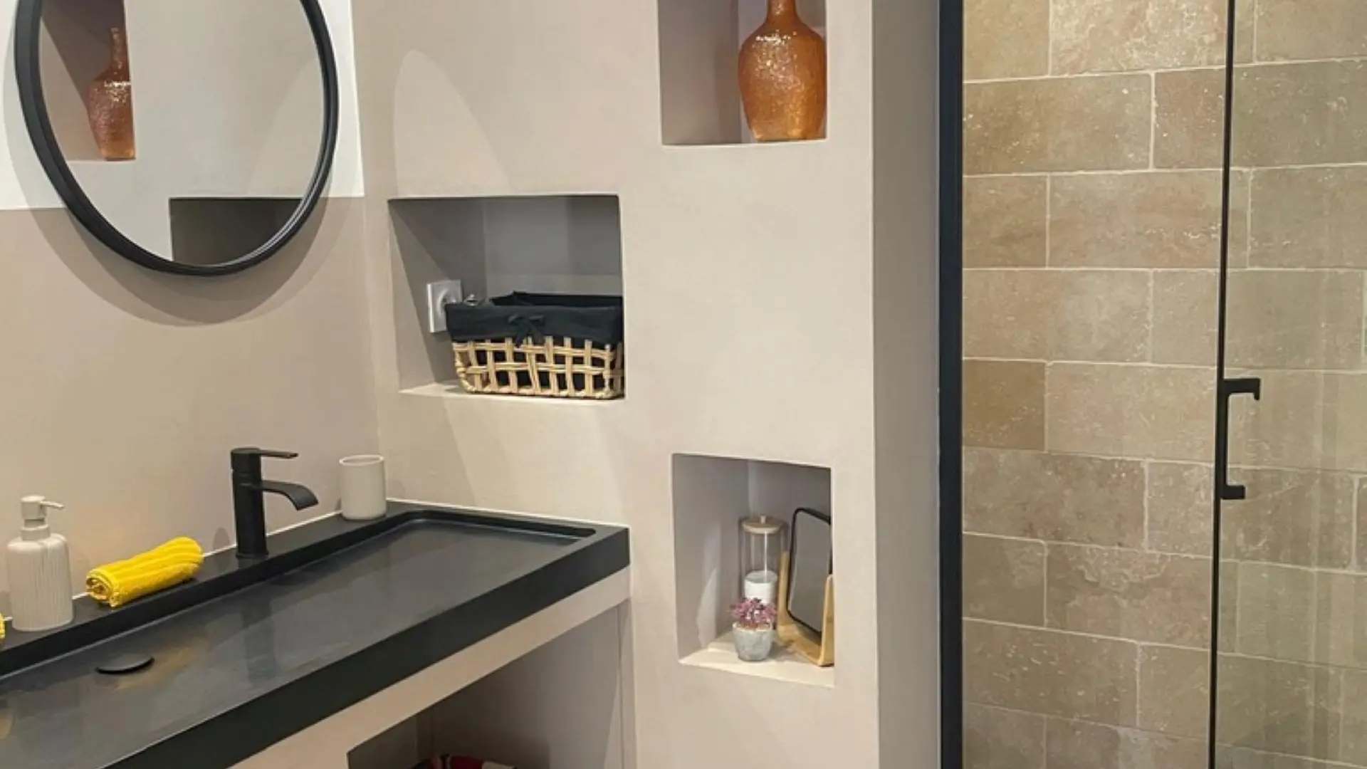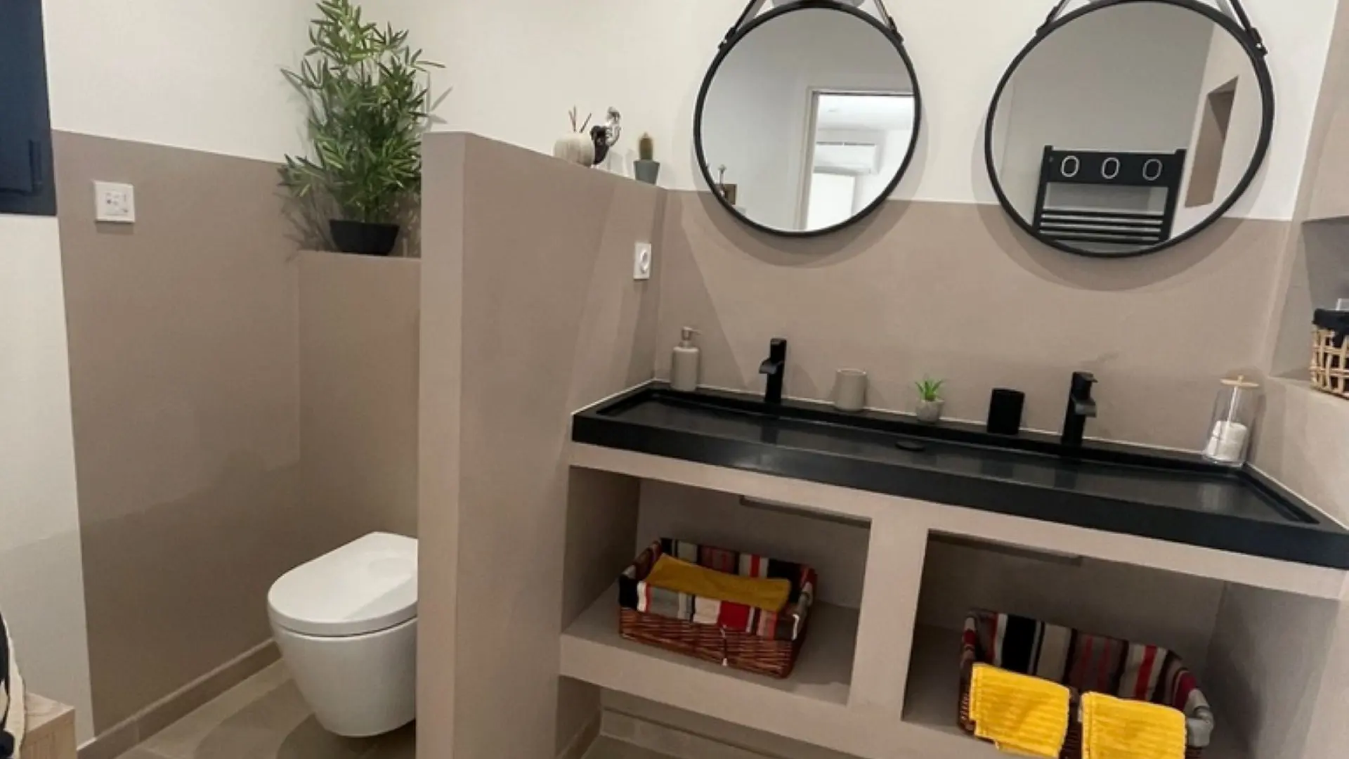 Avec un lit king-size, des oreillers à votre convenance (50x70 ou 60x60, plus ou moins moelleux), 1 grande douche à l'italienne, 1 double vasque en pierre et wc, les draps et serviettes de bains sont fournis lors de votre séjour ainsi que gel douche, shampoing etc ...).