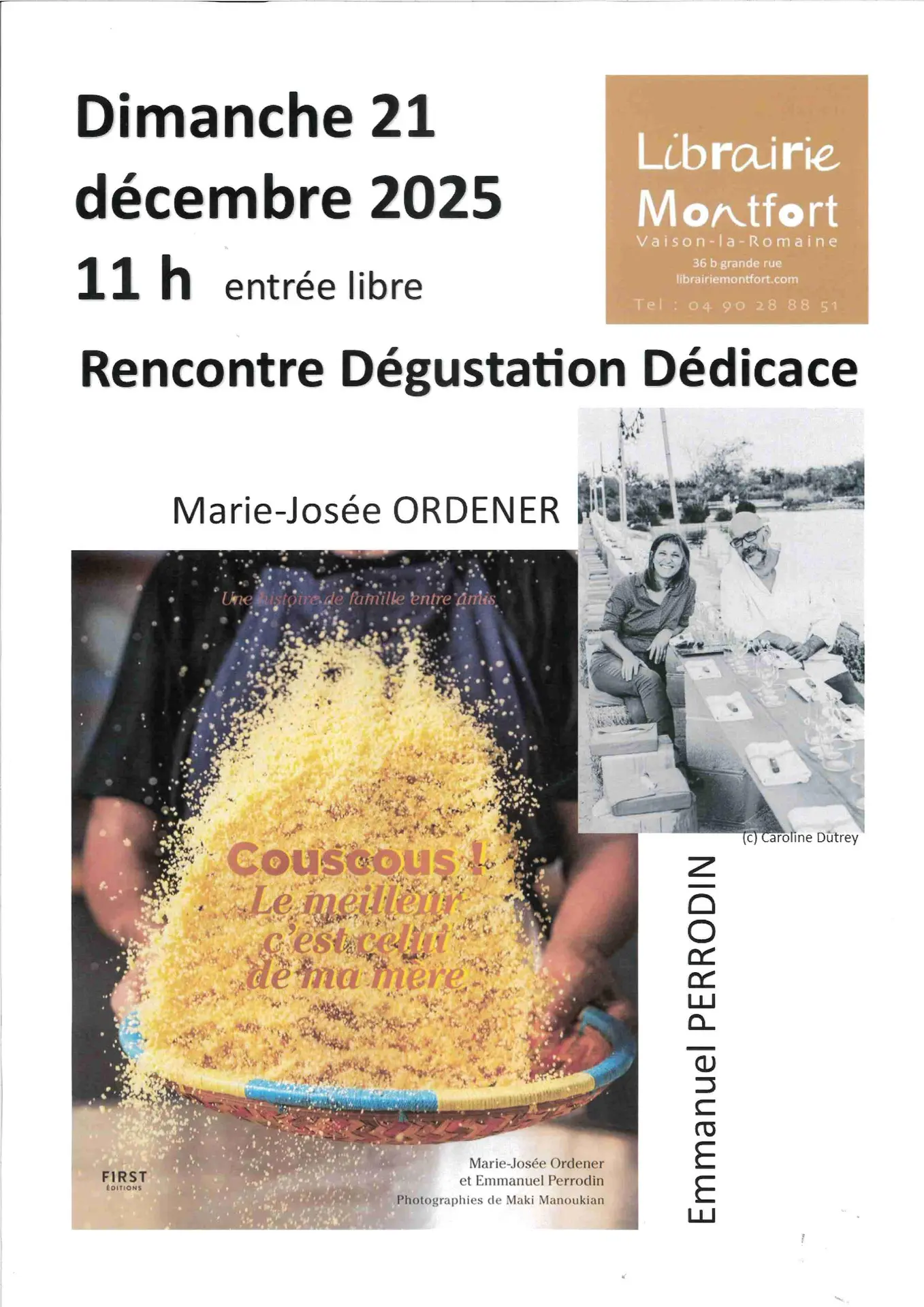 Découvrez le livre Couscous ! Le meilleur, c’est celui de ma mère de Marie-Josée Ordener et Emmanuel Perrodin, sur l’histoire de famille entre amis. Venez échanger avec les auteurs autour d’une dégustation conviviale à la Librairie Montfort.