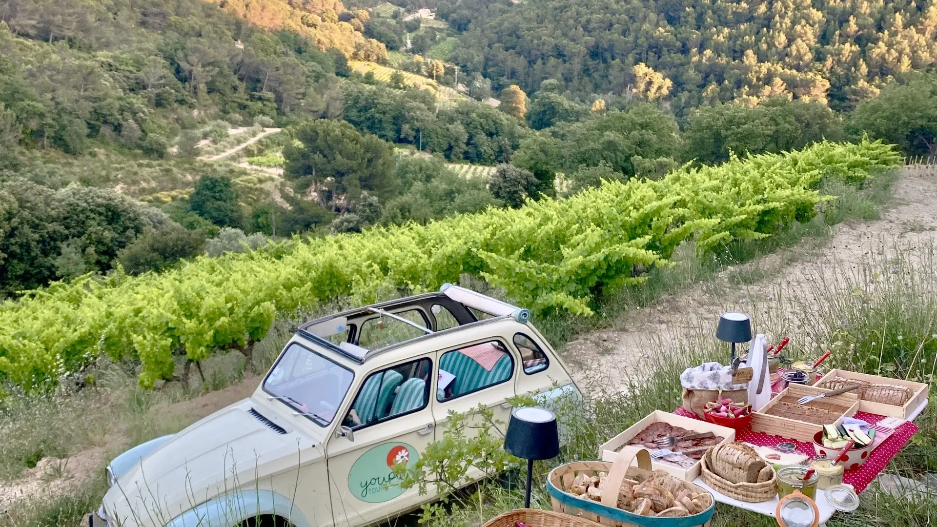Au programme : un circuit découverte alliant nature et villages charmants à bord de la Dyane 70s pour 2 ou 3 personnes. Suivi d'un apéro dînatoire panoramique. Un régal pour les yeux et les papilles ! Véritable apéro gourmand avec olives vertes et noires de Nyons, purée d'olive, flans de légumes, charcuteries, fromages de chèvre et de brebis, pains variés, fruits de saison, etc... Côté boissons : vin ou jus de fruit bio, eau plate et gazeuse. Buffet vegan ou sans alcool sur demande.